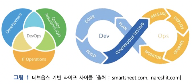 - 개발-통합-테스트(QA)-런칭-운영-모니터링 전반의 사이클을 다양한 자동화 도구들을 활용하여 개발자가 주도적으로 관리하는 것이 데브옵스의 기본 철학이다.